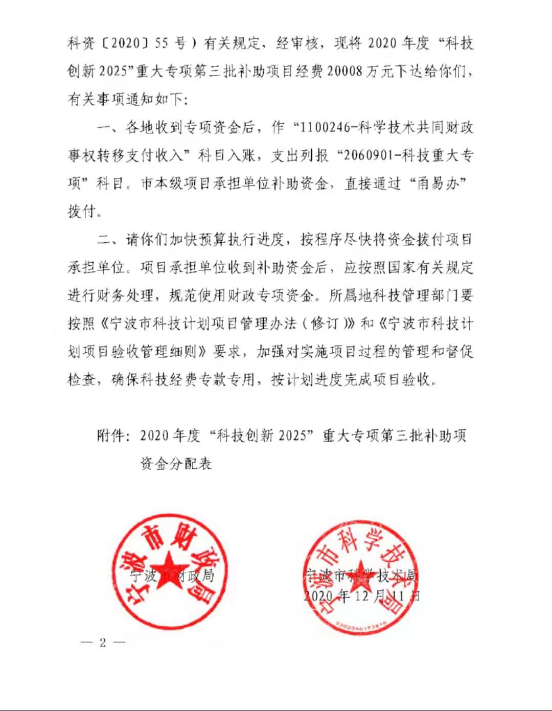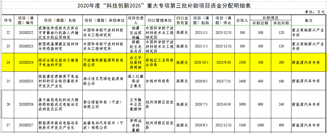 12月15日,寧波市財(cái)政局印發(fā)《關(guān)于下達(dá)寧波市2020年度科技發(fā)展專項(xiàng)資金(重大專項(xiàng)第三批補(bǔ)助項(xiàng)目)的通知》(甬財(cái)政發(fā)[2020]1214號),由寧波維科新能源科技有限公司為主要承擔(dān)單位申報(bào)的《高安全高比能動(dòng)力鋰離子電池的開發(fā)》項(xiàng)目成功獲得寧波市2020年度“科技創(chuàng)新2025”重大專項(xiàng)立項(xiàng),并取得首期補(bǔ)助項(xiàng)目資金200萬元。