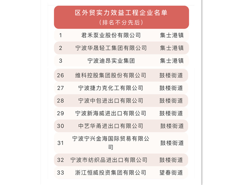 為充分發(fā)揮骨干外貿(mào)企業(yè)的引領(lǐng)示范作用,帶動海曙廣大外貿(mào)企業(yè)積極融入國際國內(nèi)雙循環(huán)新發(fā)展格局,根據(jù)市商務(wù)局有關(guān)要求,結(jié)合海曙區(qū)實(shí)際,決定實(shí)施2021年海曙區(qū)外貿(mào)實(shí)力效益工程和外貿(mào)實(shí)力培育工程。經(jīng)過綜合打分的辦法,最后遴選出40家海曙區(qū)外貿(mào)實(shí)力效益工程企業(yè)(流通型、生產(chǎn)型各20家)和10家海曙區(qū)外貿(mào)實(shí)力培育工程企業(yè),維科集團(tuán)榜上有名。