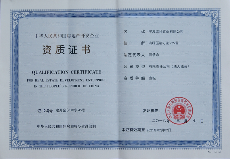 2018年3月7日,國家住房和城鄉(xiāng)建設(shè)部通過了寧波維科置業(yè)有限公司房地產(chǎn)開發(fā)一級資質(zhì)延續(xù)審核,頒發(fā)了編號為建開企【2009】845號的中華人民共和國房地產(chǎn)開發(fā)企業(yè)資質(zhì)證書。維科置業(yè)房地產(chǎn)開發(fā)一級資質(zhì)再次獲得順利延續(xù)。