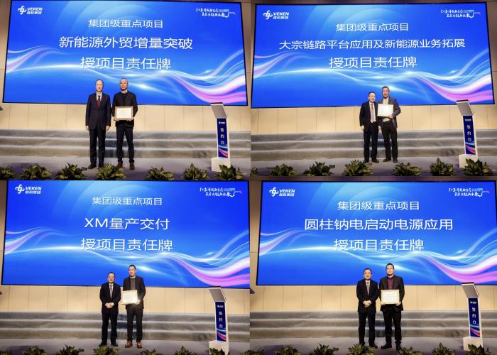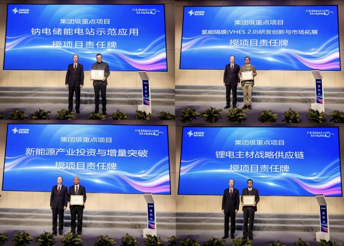 會上,鈉電儲能電站示范應用、氫能隔膜( VHES 2.0)研發(fā)創(chuàng)新與市場拓展、新能源產業(yè)投資與增量突破、鋰電主材戰(zhàn)略供應鏈、新能源外貿增量突破、大宗鏈路平臺應用及新能源業(yè)務拓展、XM量產交付、圓柱鈉電啟動電源應用等八個集團級重點項目的責任人從項目意義、項目目標、團隊成員、項目工作措施、項目存在風險及應對、項目里程碑節(jié)點、項目資源需求等方面對項目進行了解碼發(fā)布。集團考薪委主任陳總,高新董事長、維科技術考薪委主任呂總對重點項目分別作了對賭考核要求,項目責任人簽署了責任狀,并授予了重點項目責任牌。