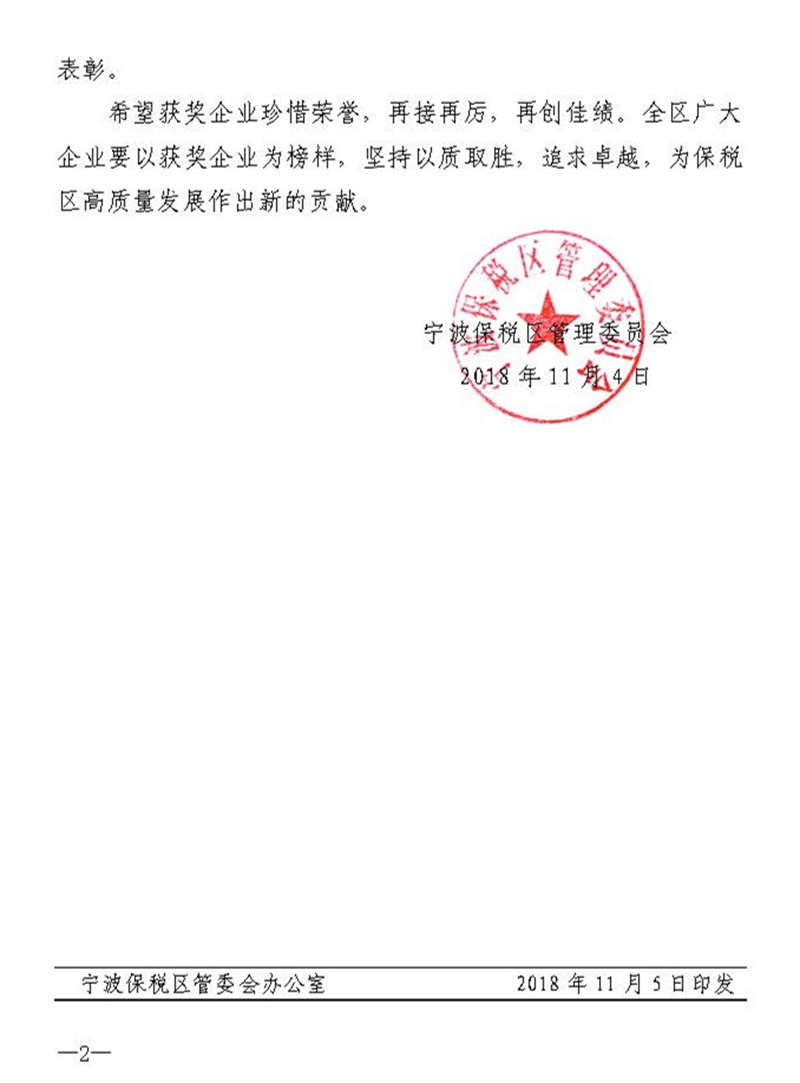 「寧波保稅區(qū)(輸出加工區(qū))品質(zhì)賞」は寧波保稅區(qū)(輸出加工區(qū))管理委員會(huì)が設(shè)立した最高品質(zhì)栄譽(yù)であり、主に本區(qū)に獨(dú)立法人資格を有し、卓越した品質(zhì)管理経営モデルを?qū)g施し、業(yè)界內(nèi)で広範(fàn)な知名度と影響力があり、著しい社會(huì)効果または経済効果を得た企業(yè)(組織)に授與される。