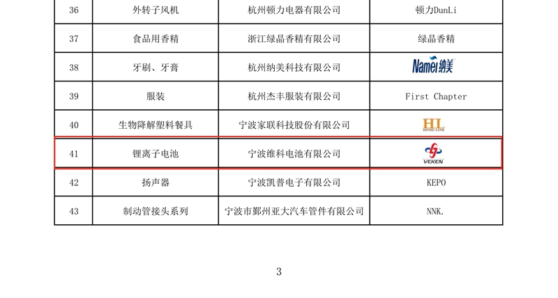 2018年11月1日、浙江省品質(zhì)技術監(jiān)督局が授権して、浙江省ブランド戦略推進委員會が選出した「浙江ブランド製品」のリストが盛大に発表され、寧波維科電池有限會社が申告した「リチウムイオンバッテリー」が「浙江ブランド製品」と認定された。